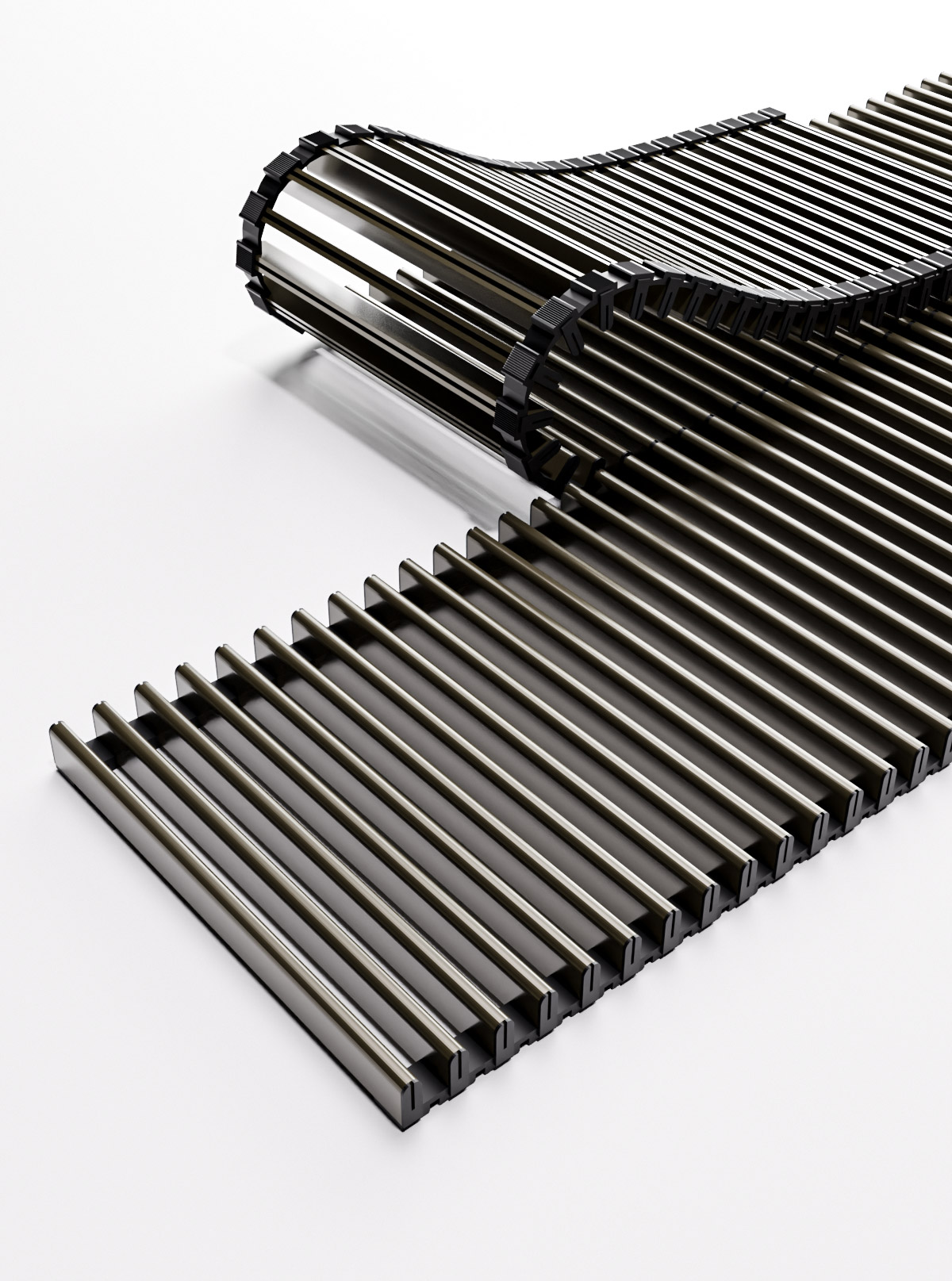 Ключевое отличие этой системы — подвижные алюминиевые прутки. Они не просто уложены в рамку, а соединены между собой специальным патентованным пластиковым соединителем. Зачем это сделано? В большинстве стандартных решёток металл соприкасается с металлом, создавая эффект барабана при каждом шаге. Здесь же пластиковый узел выступает демпфером. В паре с резиновыми упорами он полностью заглушает ударный шум — вы не услышите характерного звона или лязга, когда по решётке пройдёт человек или домашнее животное.