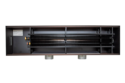 Модель представлена в компактных габаритах: ширина монтажного корпуса составляет 180 мм при высоте всего 140 мм. Такие параметры позволяют интегрировать конвектор даже в невысокую стяжку, сохраняя полезную высоту помещения. Длина изделия подбирается индивидуально под размеры оконного проема или зоны обогрева — от 1000 до 5000 мм, что гарантирует точное попадание в проект без потери эффективности. В основе теплотехнической составляющей лежит однослойный теплообменник, обеспечивающий быстрый и мощный нагрев воздуха. Он идеально справляется с созданием тепловой завесы у витражей, блокируя проникновение холода снаружи.