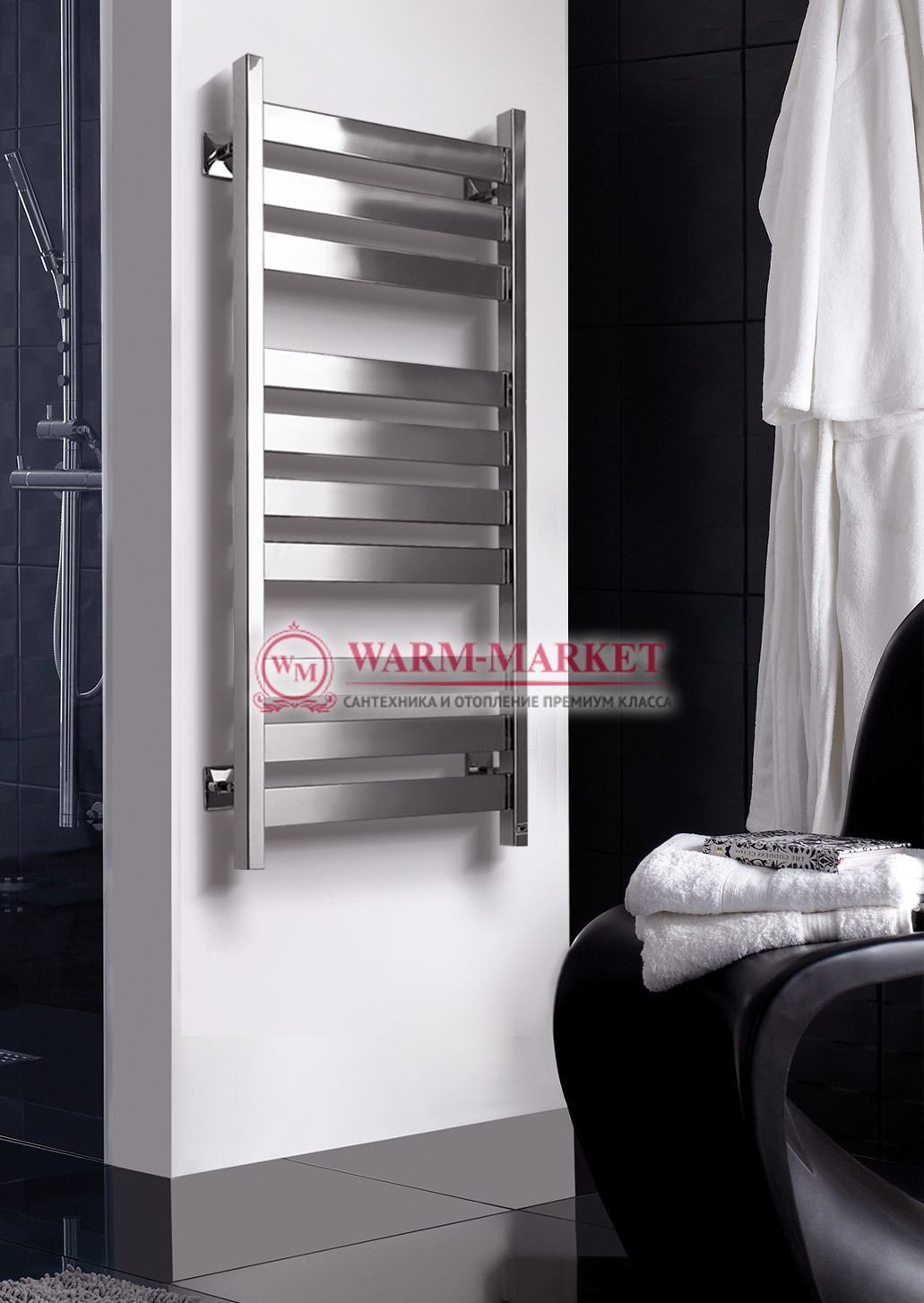 Сочетание брутальности, основательности и в то же время трогательной заботливости делает эту модель необычайно привлекательной. Мощные вертикальные коллекторы квадратного профиля соединены с широкими пластинами перекладин, за счет тесного расположения в блоках составляющих почти сплошное зеркальное полотно. Блоки перекладин имеют между собой четко выверенные расстояния, не позволяющие всей конструкции «рассыпаться», но в то же время достаточные для развешивания объемных полотенец. Строгость четкой геометрии смягчена наличием выбивающейся из единой глянцевой плоскости полочки, которая придает модели определенный шарм и добавляет практичности.