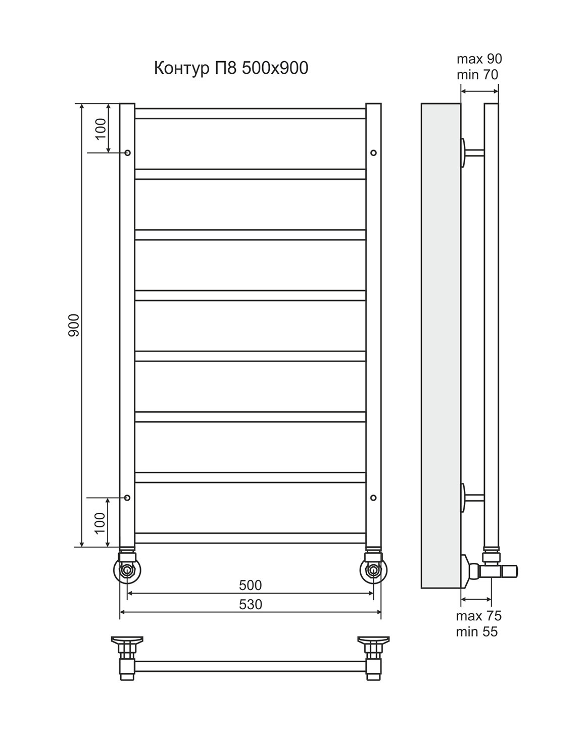 Контур П8-3 - водяной полотенцесушитель, нижнее подключение, черный